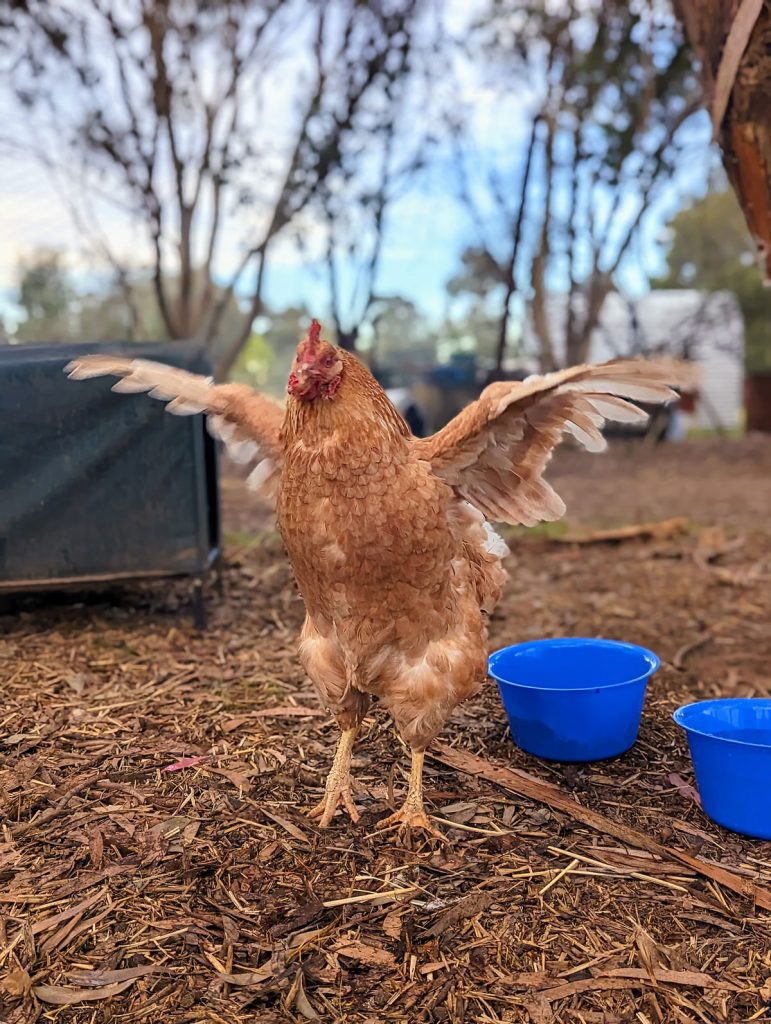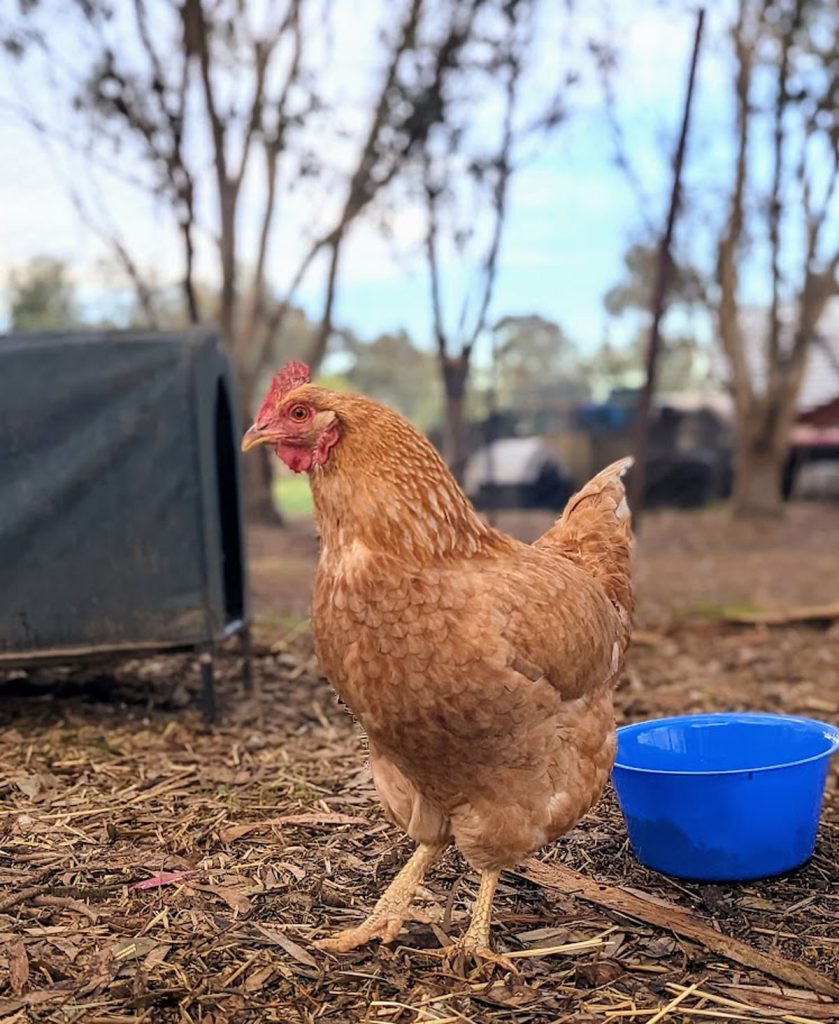 Thankfully this lovely gal had a kind soul who took concern with her and her sisters predicament. Care taking as best she could and intervening to provide vet care and find them more suitable homes when she was able. Ranni came in strong, determined not to be at the bottom of the pecking order and enjoys bossing a couple of the other girls around although it did take her some time to integrate with the flock. She loves corn, like REALLY loves it and will peck at it fiercely fast to win the corn eating competition as soon as dinner is served! And if we must pick her up she is hesitant to start with, but then she snuggles in and enjoys a cheek scratch. Our little Lunar Princess is now a fully fledged and much loved member of the chicken flock.