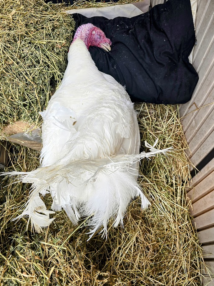 Fenrir was sent home with very strong pain medication to keep him comfortable and afford him a chance to fight for his life. On Tuesday he seemed much brighter and stronger. Although his appetite still hadn’t returned and full nursing and feeding assistance was required, he showed promising signs of the innate curiosity that exudes from all Turkeys as we watched him perk up, observing his surroundings and enjoying his increased strength. Sadly our growing hopes faded as we greeted Fenrir this morning (Wednesday), he had headed down hill, appearing flat and lackluster.
